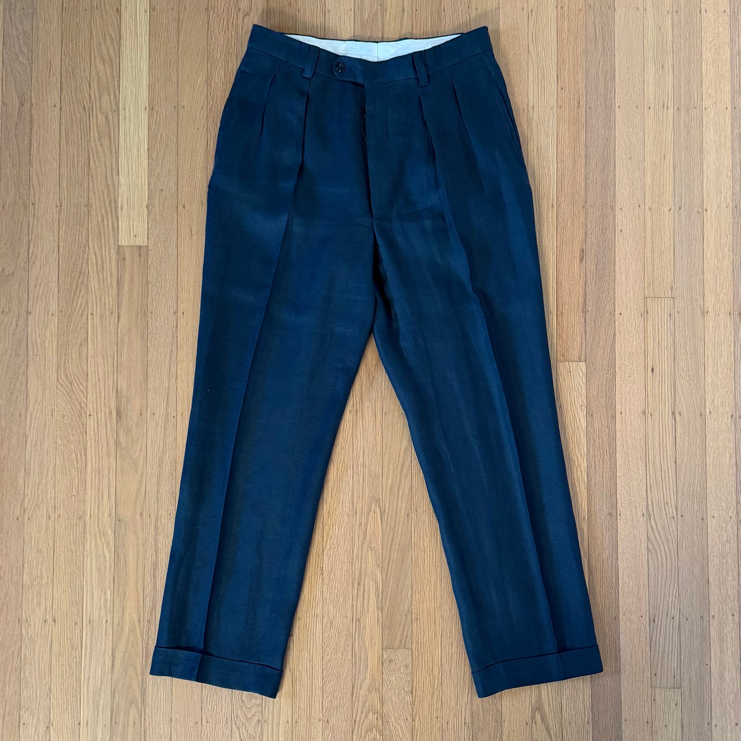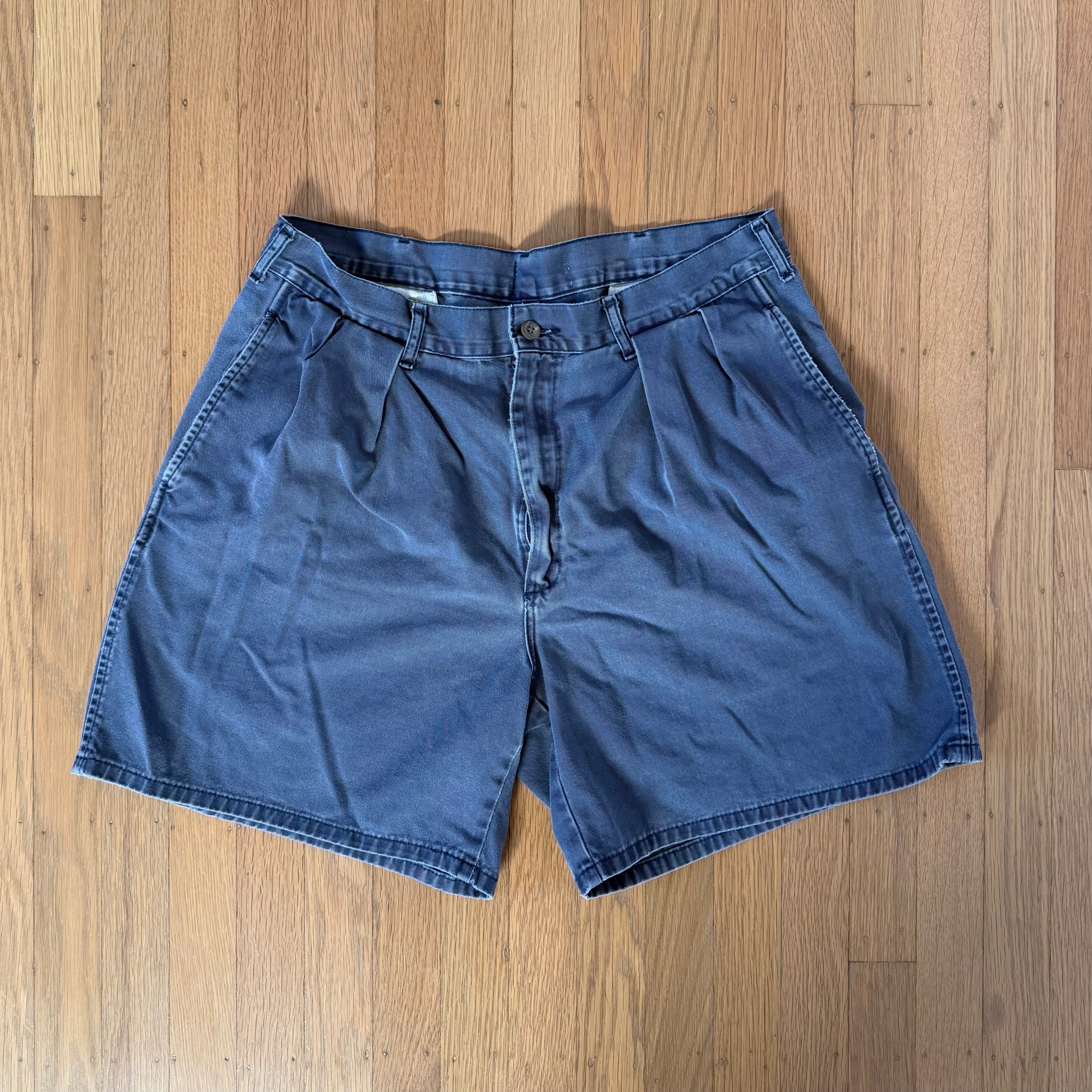 Double pleated, with a classic 6” length. Seams and stitching faded to a nice robin’s egg blue, a few frays just starting to express themselves for a bit of character. Generously wide through the hem—an absolute necessity for me and my cyclist thighs.
