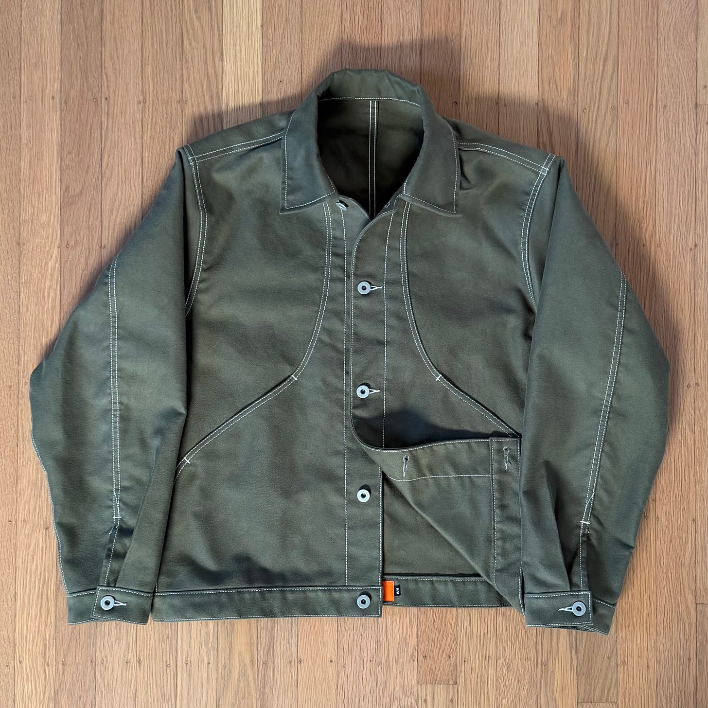 The Swoop Jacket is Henry’s signature style. This particular specimen is cut from a heavyweight cotton moleskine in a pleasant shade of olive green. So far, it seems to go with just about anything: wool trousers, double-knees, and everything in between.