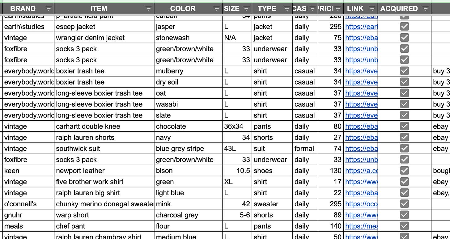 To manage this process, I spun up a spreadsheet. I couldn’t buy everything I wanted to right away, but I could catalog it. Over time, I could also track these purchases, giving me insight into how my wardrobe was and wasn’t changing. Was I over-indexed on jackets? How long had it been since I bought new socks? Was I paying too much attention to pants? The spreadsheet revealed all (including the fact that you can never pay too much attention to pants).