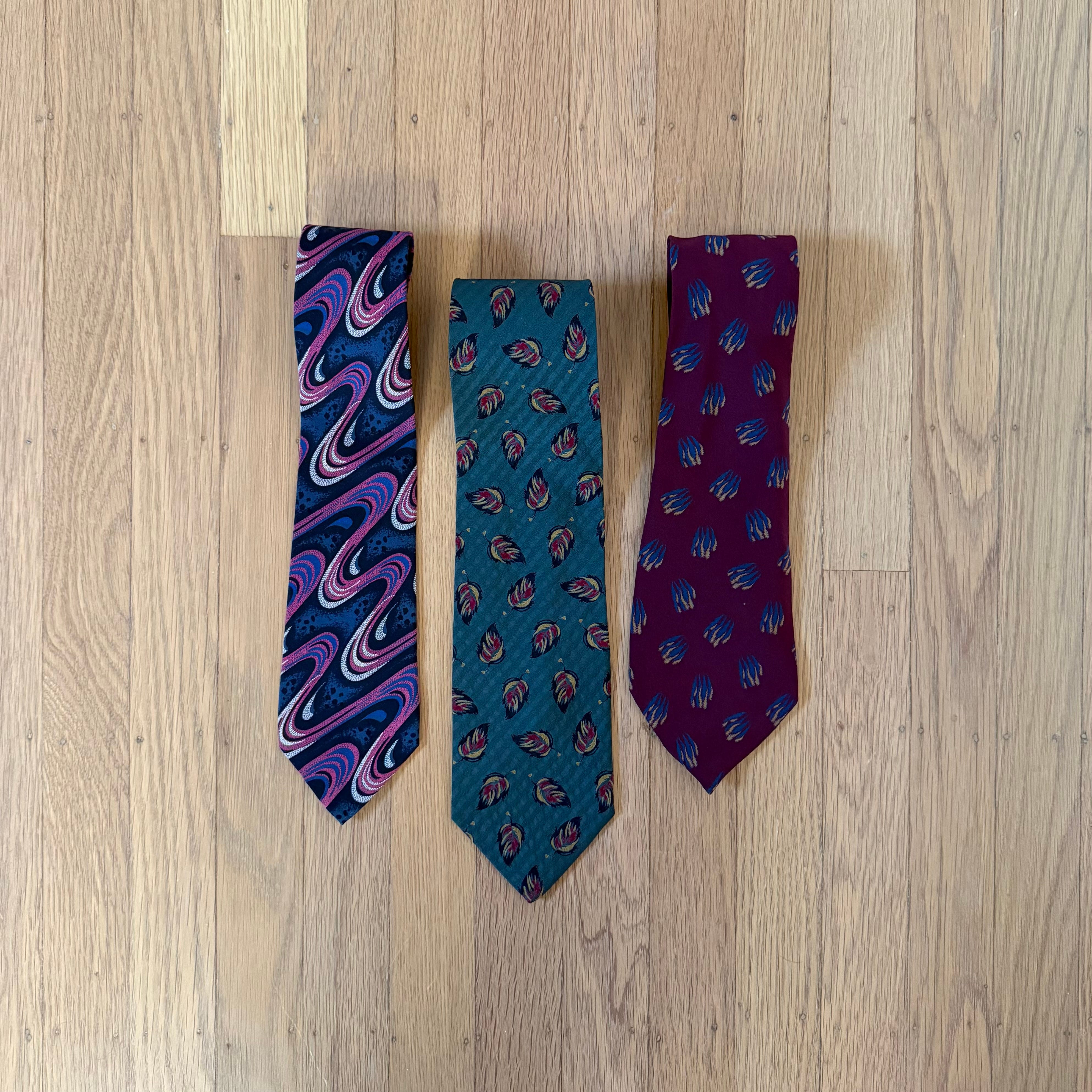 I bought a lot of four vintage Armani ties on eBay for about $40, plus one more (pictured on the left in the above image) for $15, so together they shook out to about $12 a pop. Made in Italy, 100% silk, in a variety of loud designs straight out of 1991. Kitsch-ish, but not kitschy. What else do you need?