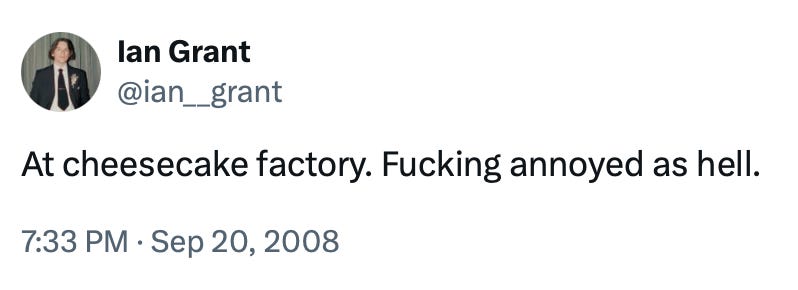 The place is an incontrovertible sewer, full of racists, sycophants, and bots, and I will forever loathe Elon Musk for his systematic destruction of a website that once meant a great deal to me. But the fact remains that that website did once exist, and I once invested a considerable portion of myself into it. I’ve been alive for 33 years, and I’ve been on @ian__grant for 17—over half my life. Whether I like it or not, it is a historical record of my time on earth.